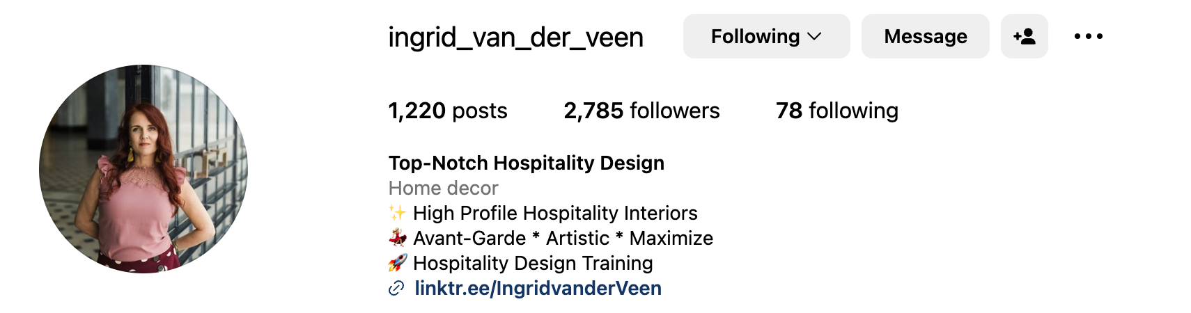 Je bio is je visitekaartje: in één oogopslag maak je duidelijk wie je bent en wat je doet. Je hebt maar weinig ruimte, 150 tekens, dus kies goede trefwoorden en een duidelijke foto. Daar is geen vaste formule voor. Toch zijn er wel dingen te noemen die goed werken. Kijk bijvoorbeeld naar de bio van hospitality designer Ingrid van der Veen.