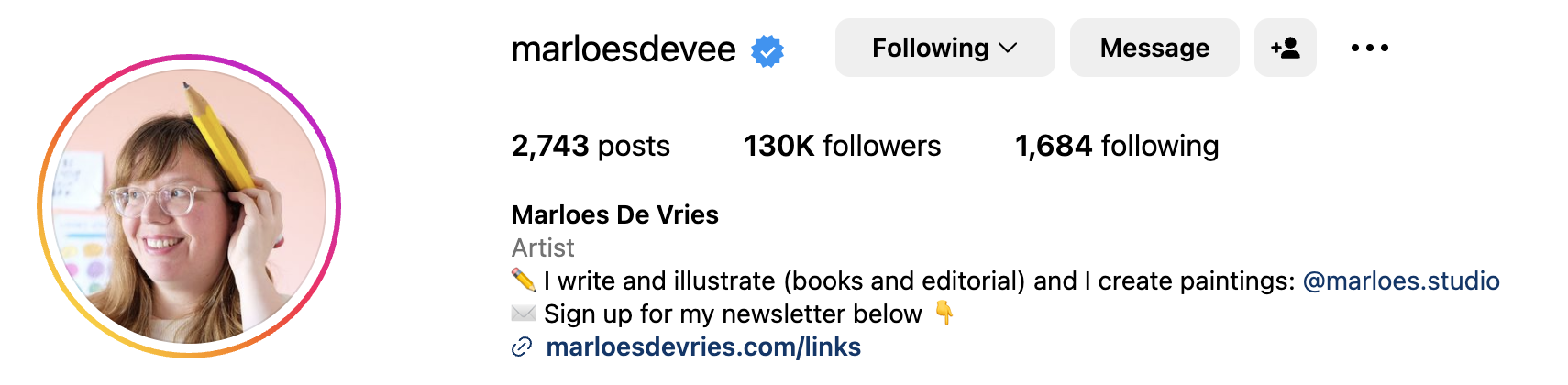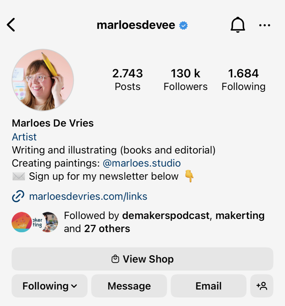 Ook bij Marloes de Vries is te zien hoe emoji’s werken. Je kunt meer informatie kwijt zonder woorden te gebruiken. En het is overzichtelijk. Marloes heeft ook een duidelijke call to action in haar bio: “Sign up for my newsletter below”. Altijd goed om te doen, “Bekijk mijn werk hier ⬇️ ” bijvoorbeeld.