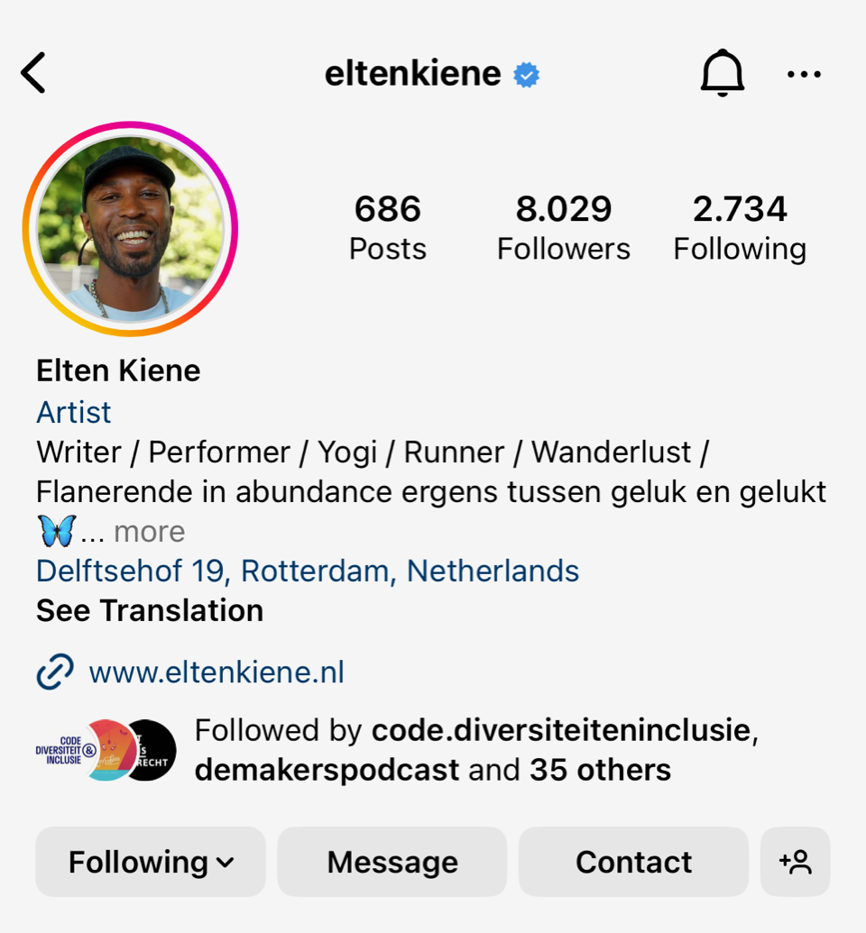 Zorg ook dat je je (studio)adres of in ieder geval woonplaats en land toevoegt in je bio, dan hoef je dat niet in de 150 tekens te melden. Zie bij het onderstaande voorbeeld van Elten Kiene. Dit doe je bij “edit profile”.Het is natuurlijk heel belangrijk dat potentiële klanten jou kunnen bereiken als ze je profiel bekijken. Als ze je werk willen kopen of als ze je willen benaderen voor een podcast, moet dat geen moeite kosten. Dus zorg dat je contactinformatie up to date is. Naast je website of Linktree moet ook je e-mailadres en je telefoonnummer waarop je gebeld op geappt kunt worden duidelijk vindbaar zijn. Als je een zakelijk profiel hebt, kun je je telefoonnummer en e-mailadres makkelijk toevoegen en zie je dat in je profiel staan onder je bio onder de button ‘contact’.