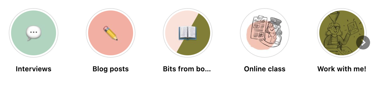 Of maak een highlight met informatie over jouzelf. Heel belangrijk: kies niet voor de automatische naam ‘hoogtepunten’, maar edit de naam van je highlight en geef je publiek een idee van wat ze te zien gaan krijgen. Je kunt foto’s gebruiken voor je hoogtepunten, zoals Sophie, maar je kunt er ook voor kiezen om ze zelf te ontwerpen. Dat kan bijvoorbeeld met Canva. Dat is een heel makkelijk en gratis programma om vormgeving te maken. Een soort simpel Adobe. Voor een rustig beeld is het fijn als je kiest voor een consistent kleurgebruik of kleuren die veel terugkomen in jouw werk. De hoogtepunten van Sophie zijn daar een goed voorbeeld van.
