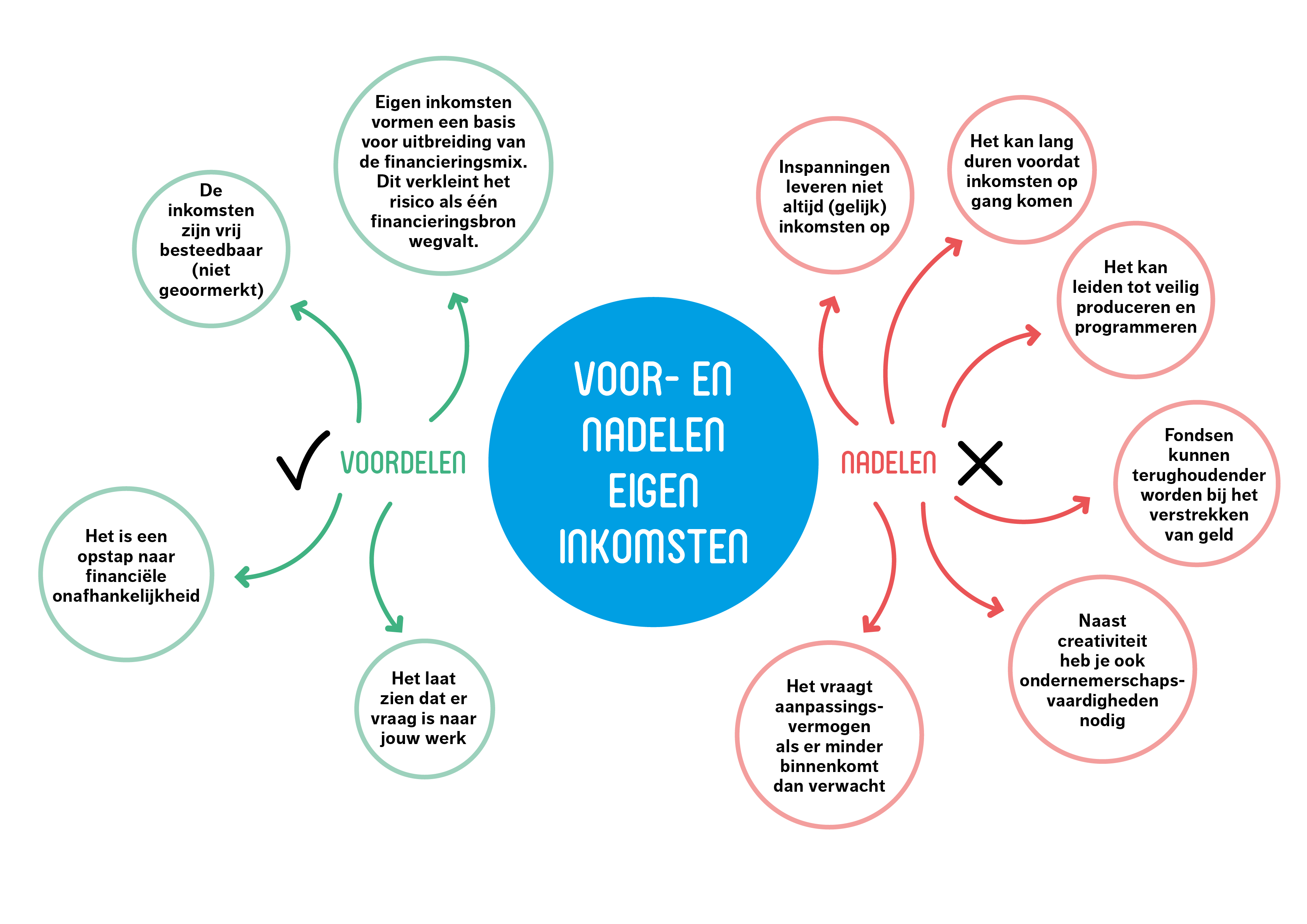 Vergeleken met subsidies en donaties geven eigen inkomsten doorgaans meer bestedingsvrijheid. Eigen inkomsten zijn immers niet geoormerkt voor een bepaald bestedingsdoel wat bij subsidies of donaties vaak wel het geval is. Daarnaast vormen eigen inkomsten een stabiele financiële basis, en vergroten ze de zelfstandigheid van organisaties en kunstenaars. Tenminste, dat wordt in de literatuur en de praktijk bevestigd.