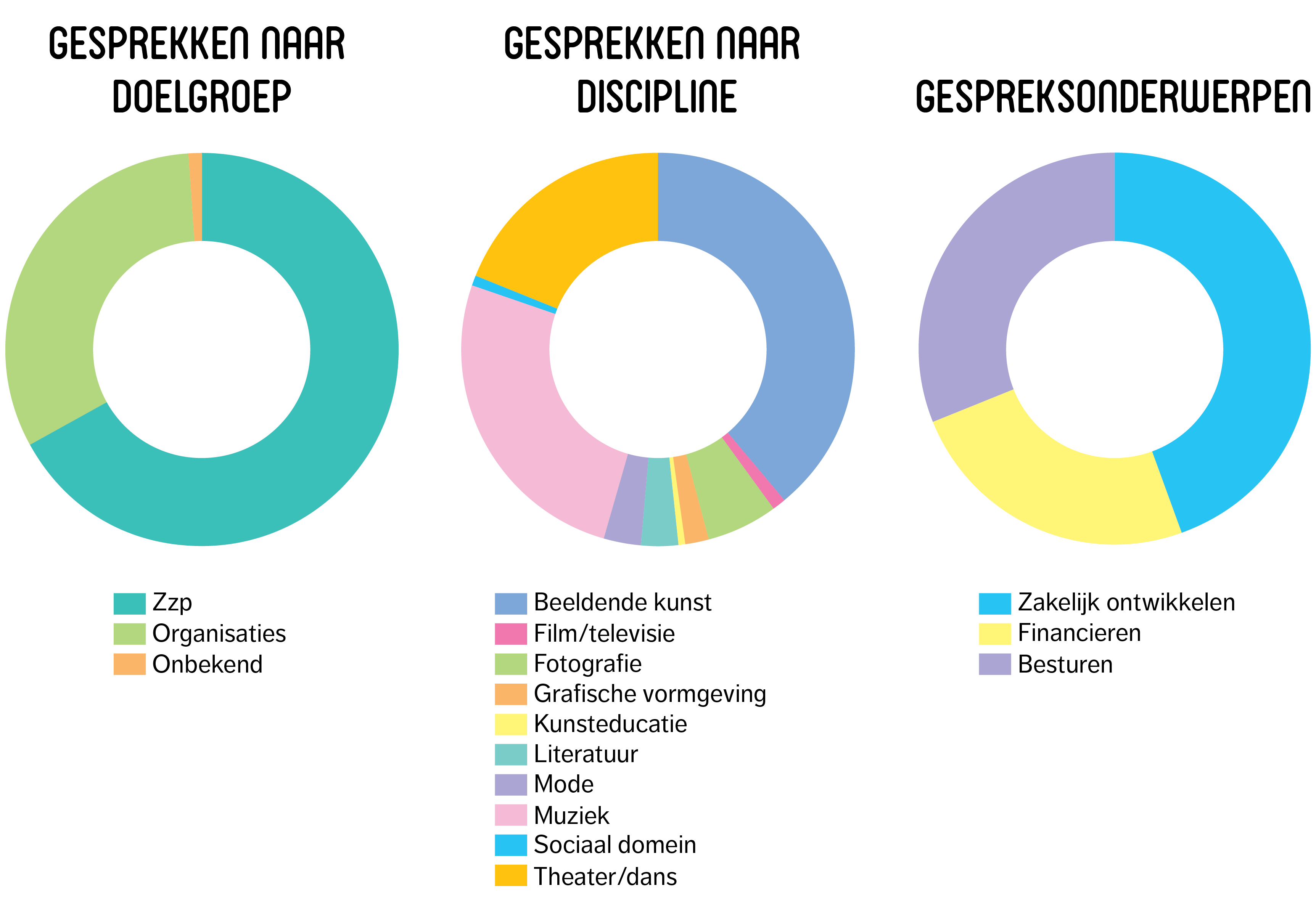 In totaal voerden 768 kunstenaars, creatieve makers en culturele organisaties een oriëntatiegesprek of een gesprek over een cultuurlening. Zo werden ze uitgedaagd om tot de kern van hun vraagstuk te komen en gemotiveerd om zich verder te ontwikkelen. Verder beantwoordden we 214 vragen via onze helpdesk, en koppelden we 298 mensen aan een adviseur of mentor uit ons netwerk. In persoonlijke adviestrajecten gaven we advies op maat. Bijvoorbeeld over nieuwe vormen van financiering, digitale verdienmodellen, het schrijven van een businessplan en het goede gesprek voeren in het bestuur of de raad van toezicht.