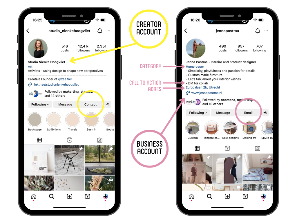In het voorbeeld van Nienke Hoogvliet, die een creator account heeft, is de categorie van haar account zichtbaar onder de profielnaam, en bezoekers kunnen contact opnemen via de knop onder de bio.